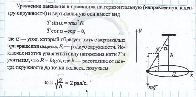 Шарик, подвешенный на легкой нити к потолку, вращается по окружности, лежащей в горизонтальной плоскости. Расстояние между точкой подвеса и центром окружности 2,5 м. Найдите угловую скорость вращения шарика