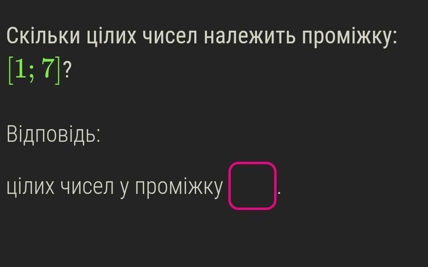 Цілими числами у цьому проміжку є: 1, 2, 3, 4, 5, 6 та 7. Їх кількість = 7