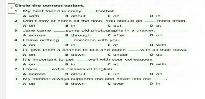 1) about 2) out 3) across 4) in 5) up 6) on 7) up 8) down