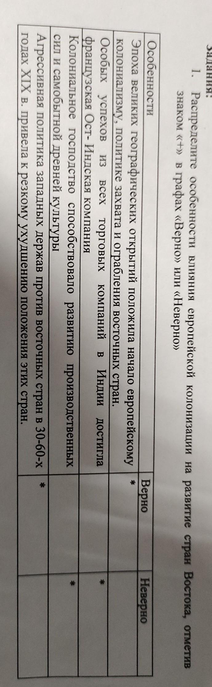 1. Распределите особенности влияния европейской колонизации на развитие стран Востока, отметиз знаком «+» в графах ПЛИЗ СОР