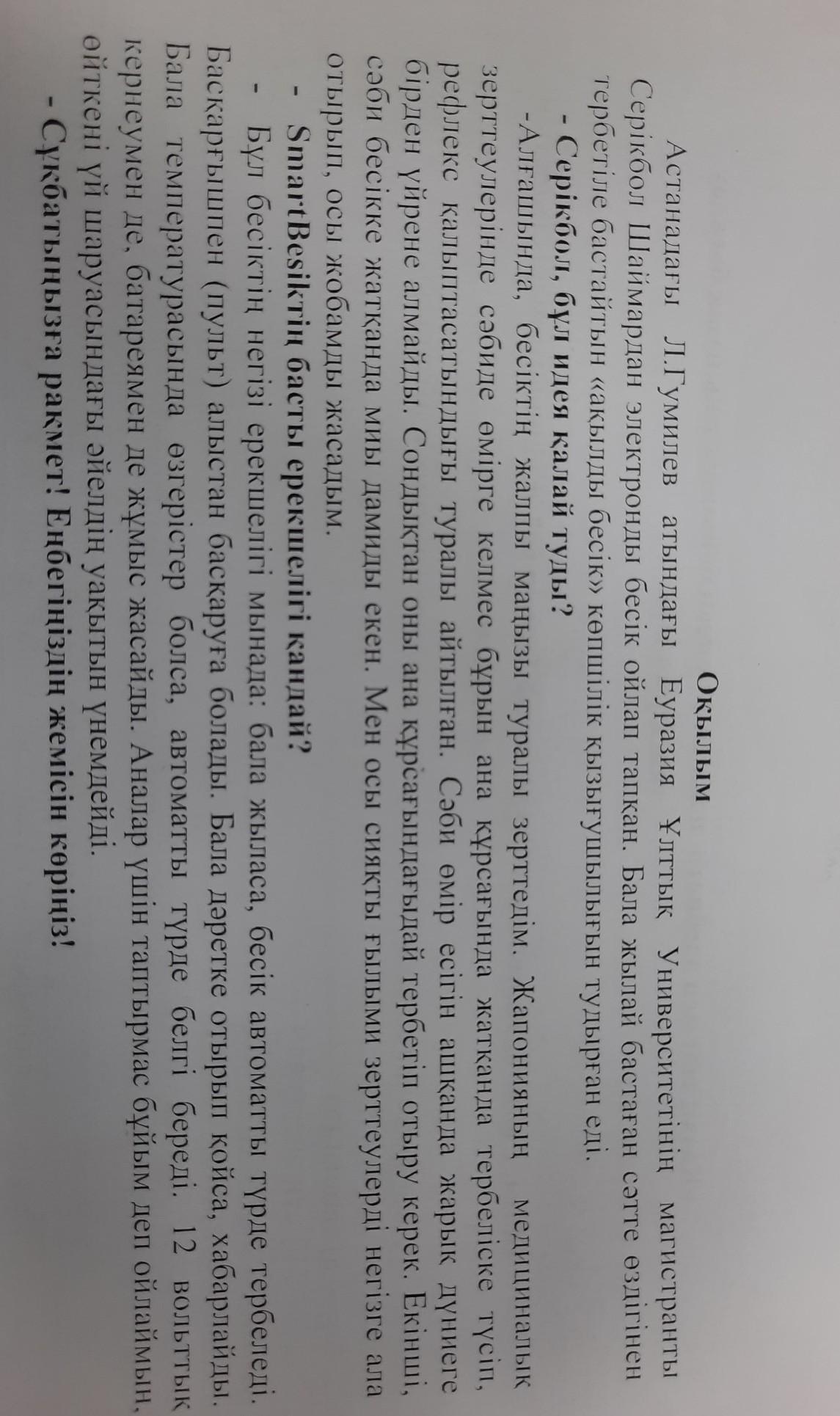2. Сукбаттың корытынды бөліміне тән акпаратты белгілеңіз. а) Сәби бесікке жатқанда миы дамиды екен. b) Бесіктің шығу тарихы айтылады c) Серікбол Шаймардан электронды бесік ойлап тапқан. d) Бала температурасында өзгерістер болса, автоматты түрде белгі береді