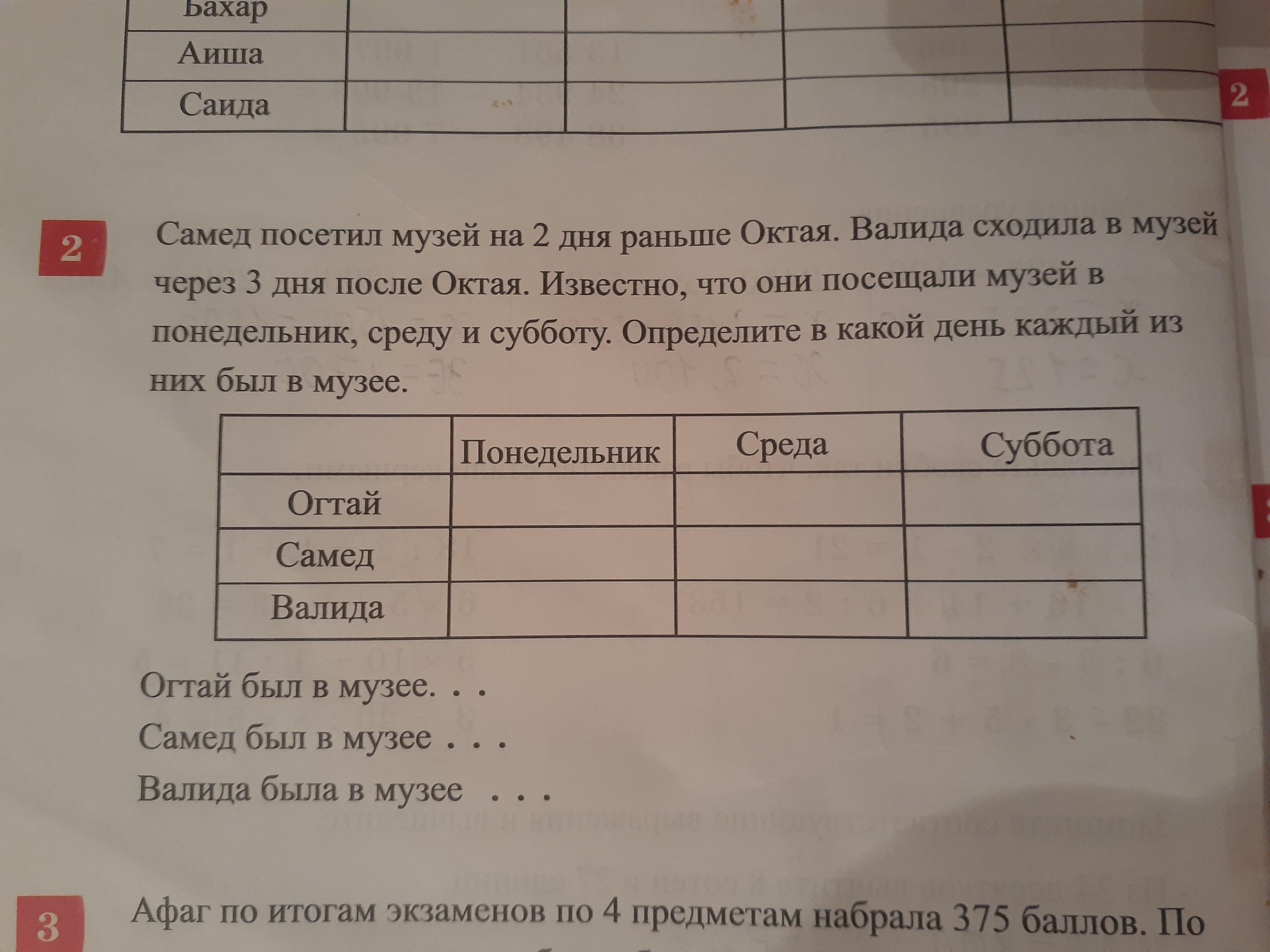 Самед был в музее в понед, Октай в среду, Валида субботу