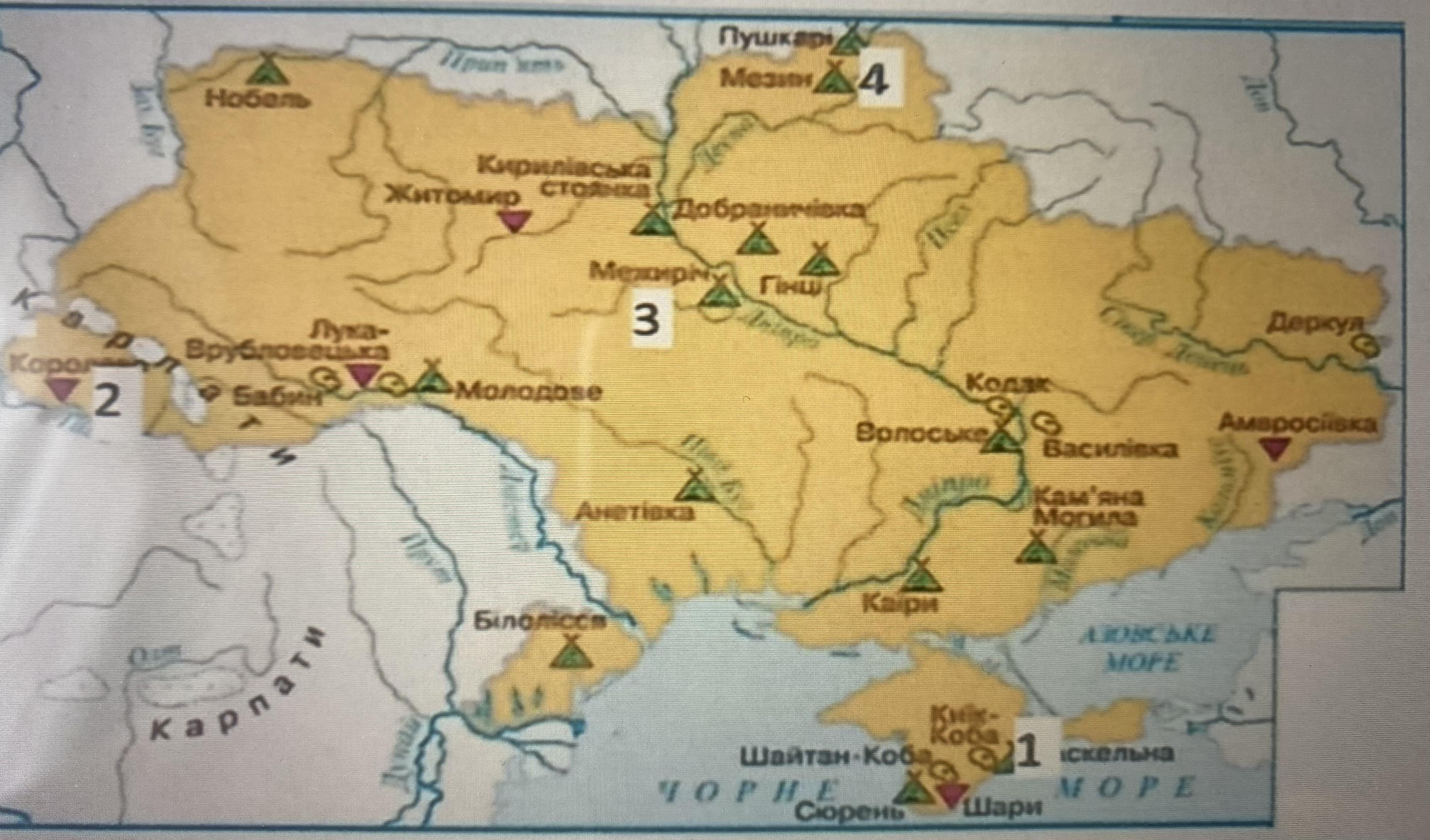 Якою цифрою на карті позначено місце найдавнішої стоянки первісних людей на території України?: