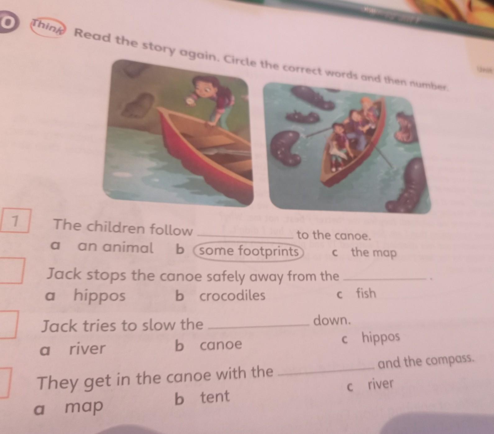 Read the story again. Circle the correct words and then number. The children follow a an animal b some footprints Jack stops the canoe safely away from the. a hippos b crocodiles Jack tries to slow the river a b canoe They get in the canoe with the a map b tent to the canoe. c the map c fish down. c hippos and the compass. criver