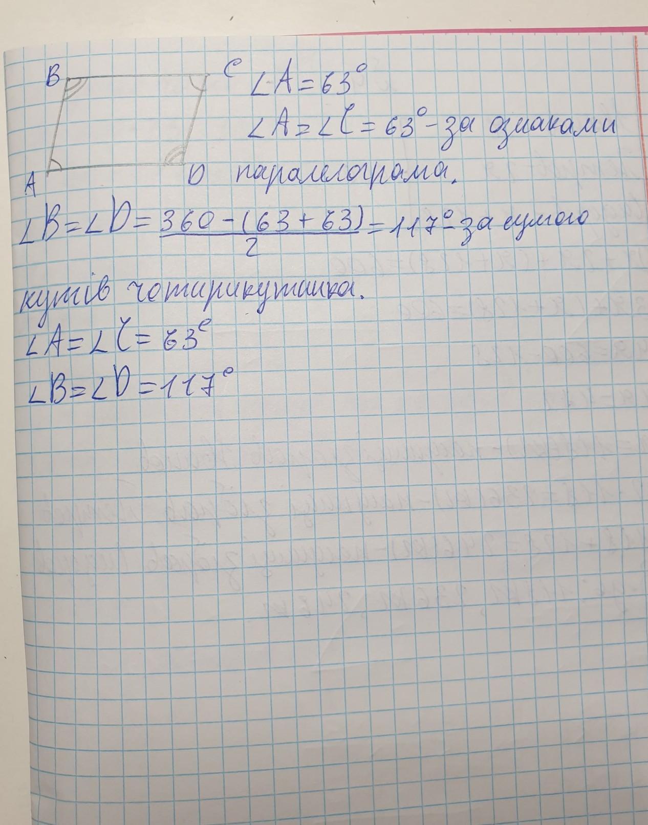 ПОМОГИТЕ ПОЖАЛУЙСТА - Знайти всі кути паралелограма, якщо один з них дорівнює: 63º .