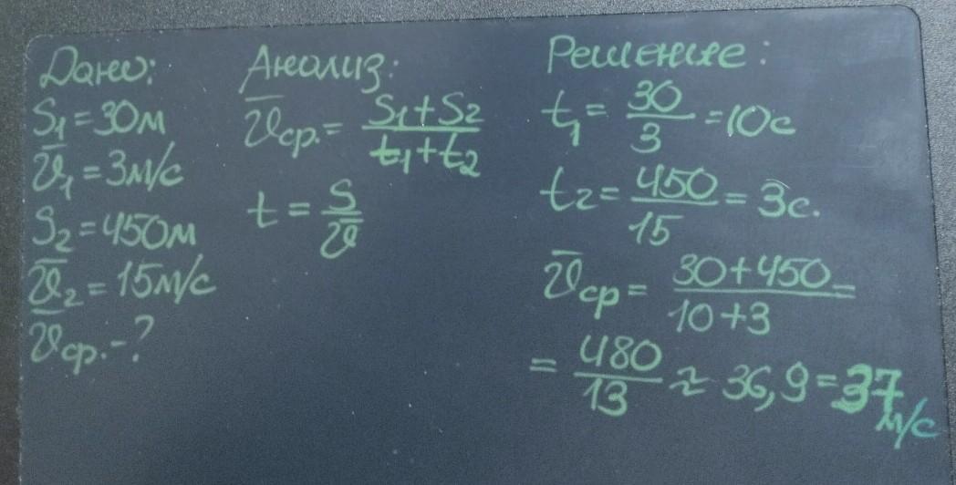 Автобус первые 30м двигался со скоростью 3 м/с, а следующие 450м двигался со скоростью 15м/с. Определите среднюю скорость автобуса на всем пути.