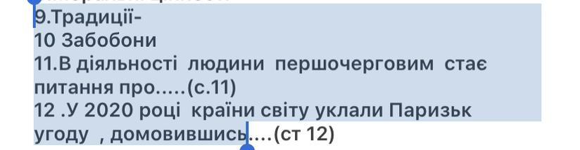 12.У 2020 році країни світу уклали Паризьк угоду , домовившись- узгоджувати заходи для зменшення викидів вуглекислого газу, щоб зупинити глобальне потепління.