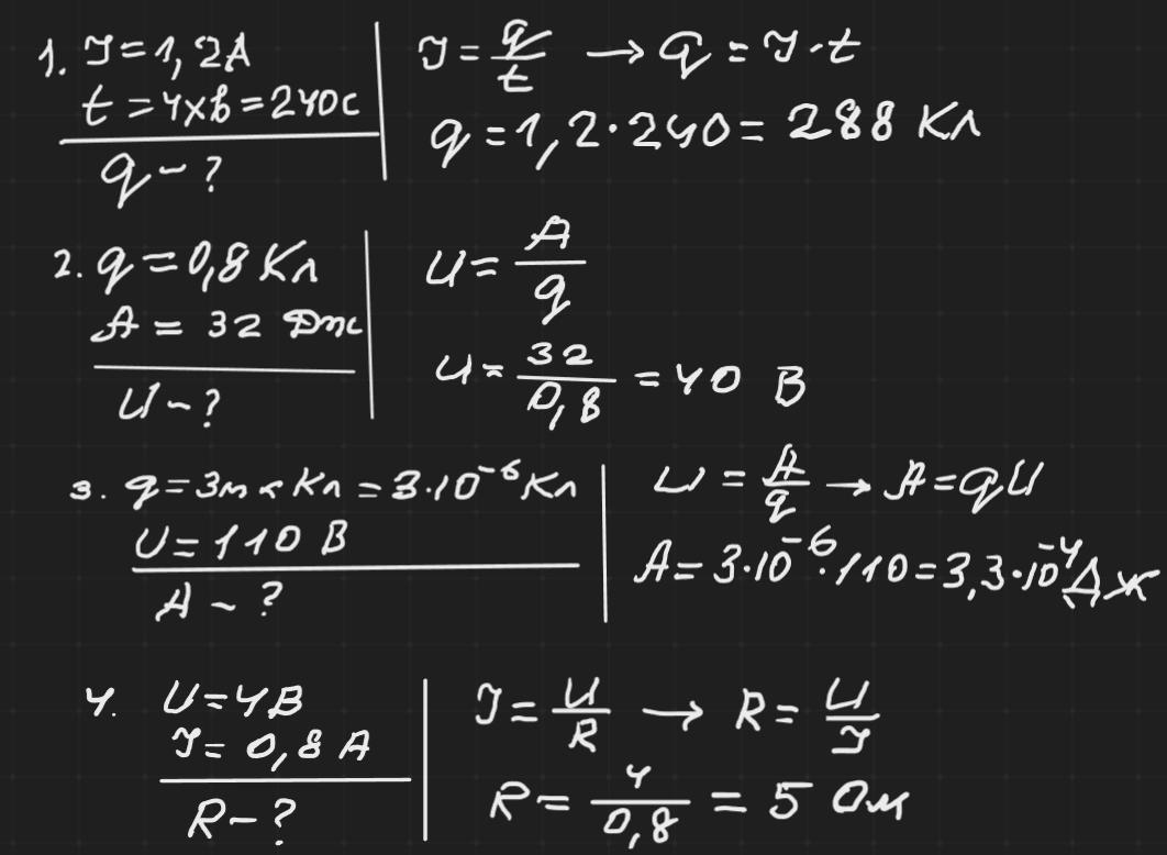 Задача1. Сила струму в колі праски 1.2А. Який електричний заряд проходить через поперечний переріз спіралі за 4 хвилини? Задача2. Знайти напругу на кінцях провідника, якщо під час проходження електричНОГО заряду 0.8 Кл виконується робота 32 Дж. Задача 3.Яка робота виконується під час переміщення заряду 3 мкКл по првіднику, напруга на кінцях якого 110 В? Задача4 Визначити опір провідника, якщо за напруги на кінцях провідника 4 В сила струму в ньому 0.8 Ом. допоможіть будь ласка