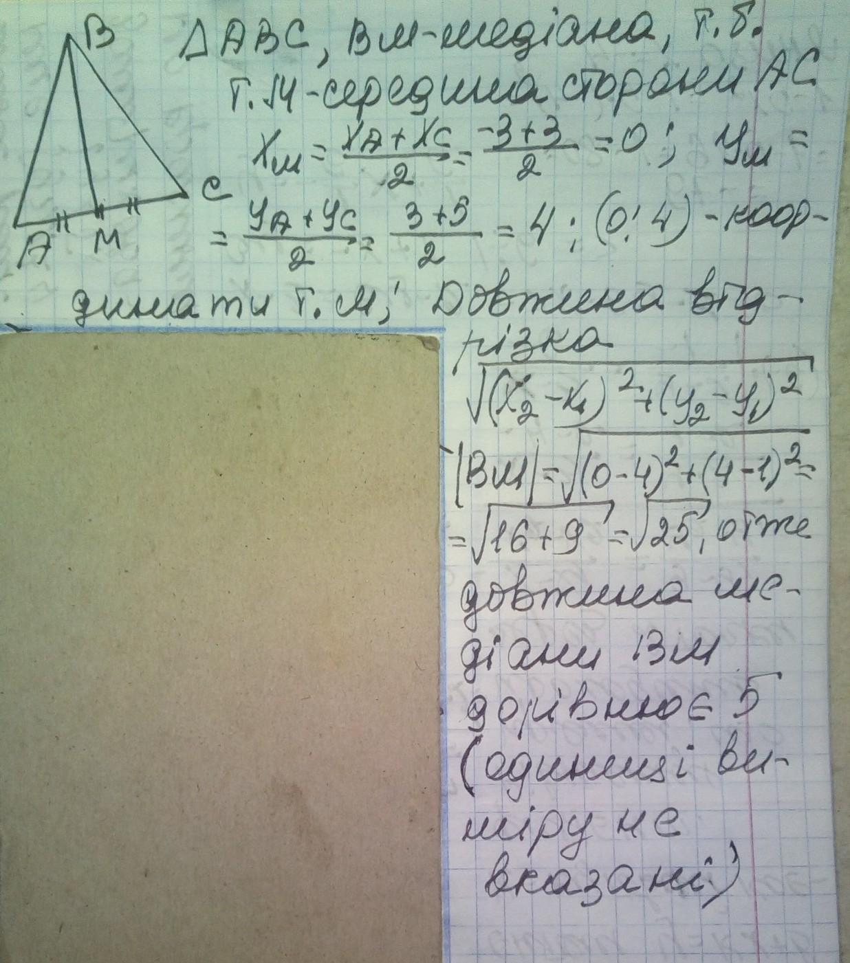 Довжина медіани ВМ трикутника АВС з вершинами А(-3;3), В(4;1) і С(3;5)