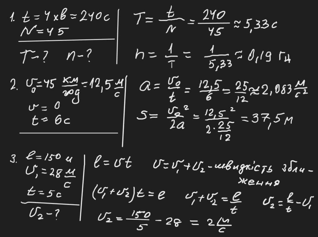 1. Обчисліть період та частоту обертання тіла, яке за 4 хв. зробило 45 повних обертів.