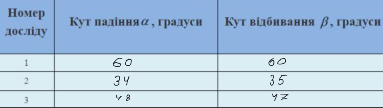 1) яке співвідношення між кутом падіння та кутом відбивання променя ви встановили;
