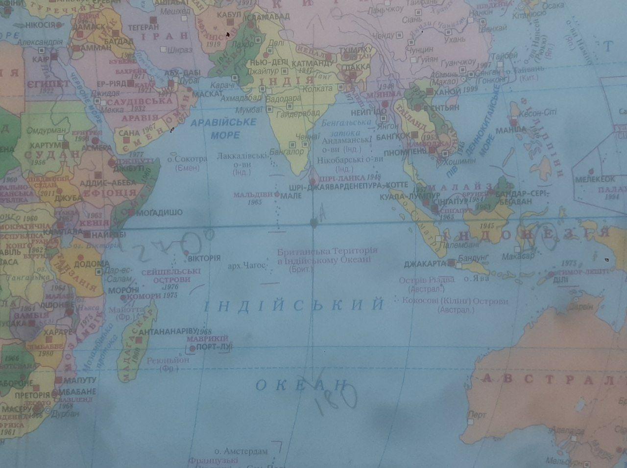 Корабель перебуває в точці з координатами 0° ш. 80° сх. д. Послуговуючись