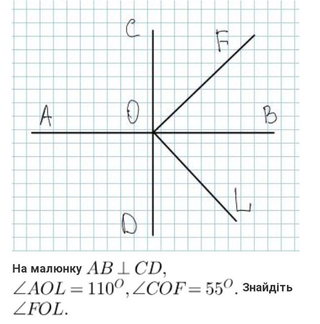 Угол FOL = угол BOL + угол FOB = 70° + 35° = 105°