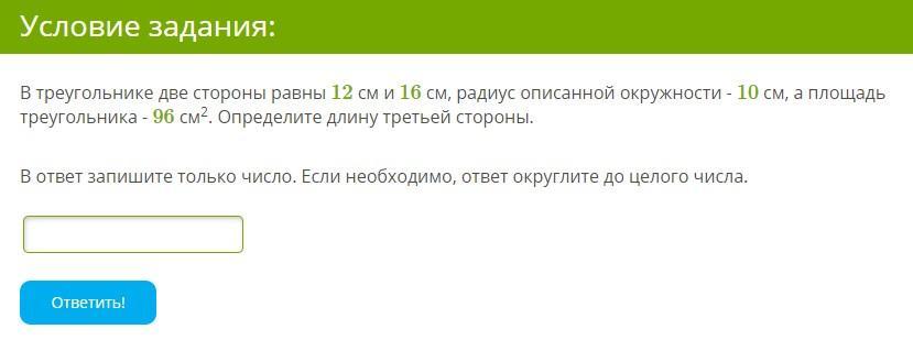 В треугольнике две стороны равны 12 см и 16 см, радиус описанной окружности - 10 см, а площадь треугольника - 96 см^2 . Определите длину третьей стороны. В ответ запишите только число. Если необходимо, ответ округлите до целого числа.
