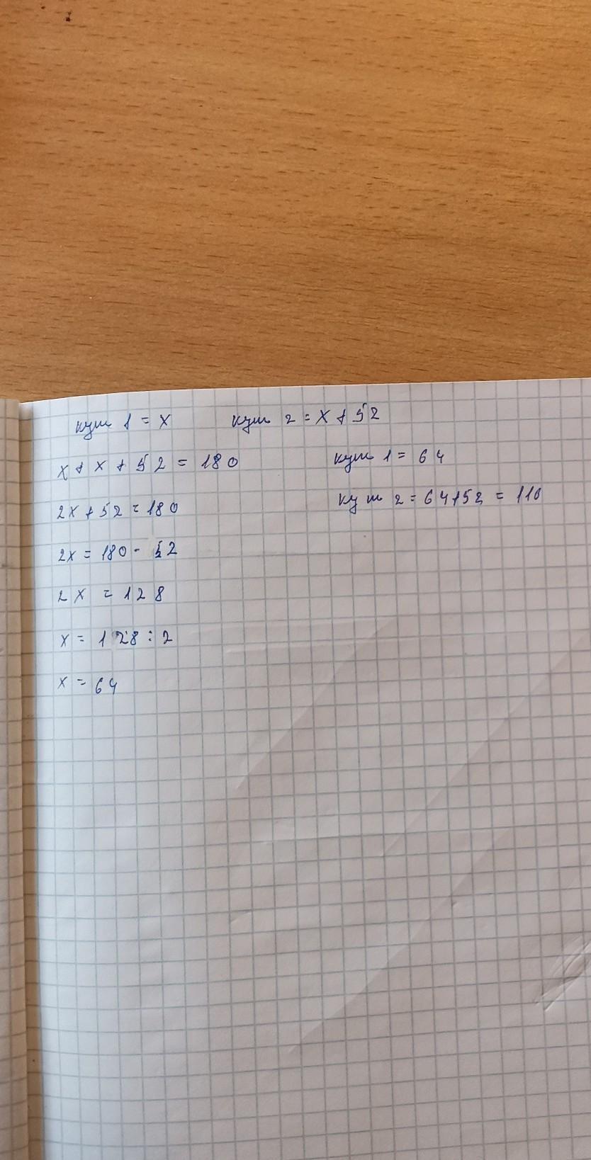 Рiзниця двох суміжних кутiв дорівнює 52°. Знайти ці кути.