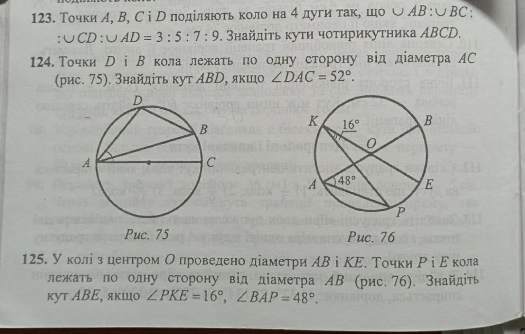 124. см рис ∠АВД и ∠АСД спираються на дугу АД ⇒ вони равні. ΔАДС прямокутний ∠АДС=90 як кут навпроти діаметра ∠АСД=90-∠ДАС=90-52=38° ⇒ ∠АВД=38°