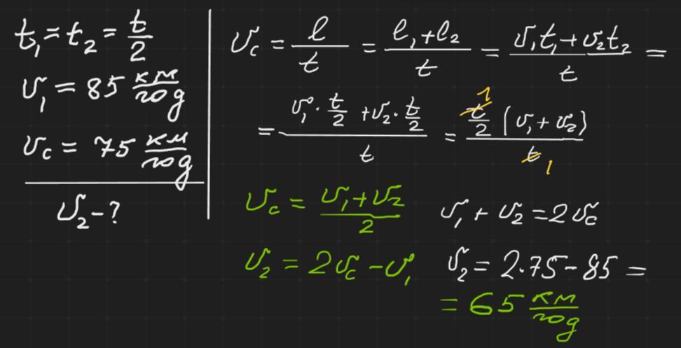 СРОЧНО!При перевезенні вугілля до пункту призначення локомотив проїхав першу половину часу зі швидкістю 85км/год. З якою швидкістю поїзд їхав другу половину часу, якщо його середня швидкість на всьому шляху становила 75км/год?