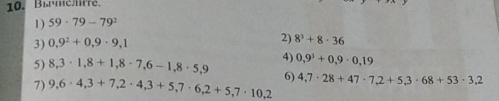 10. Вычислите. 1) 59 79-79² 3) 0,92 +0,9 9,1 5) 8,3 1,8 + 1,8 7) 9,6 4,3 +7,2 7,6-1,8-5,9 4,3 +5,7 6,2 +5,7-10,2 2) 8³ +8-36 4) 0,9³ +0,9 0,19 6) 4,7-28+47 7,2+5,3 68 +53-3,2