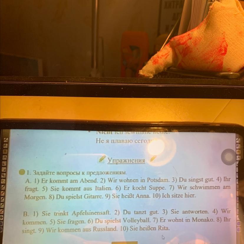 Kommt er abends? Wir wohnen in Potsdam? isst du gut Kommt sie aus Italien? Macht er Suppe? Schwimmen wir morgens? Spielst du Gitarre? Ihr Name ist Ann? Sitze ich hier? Trinkt sie Orangensaft? du tanzt gut bist du verantwortlich? Wir sind hier? du fragst? Spielst du Volleyball? Lebt er in Monaco? Wirst du essen? Wir sind aus Russland? Ihr Name ist Rita?