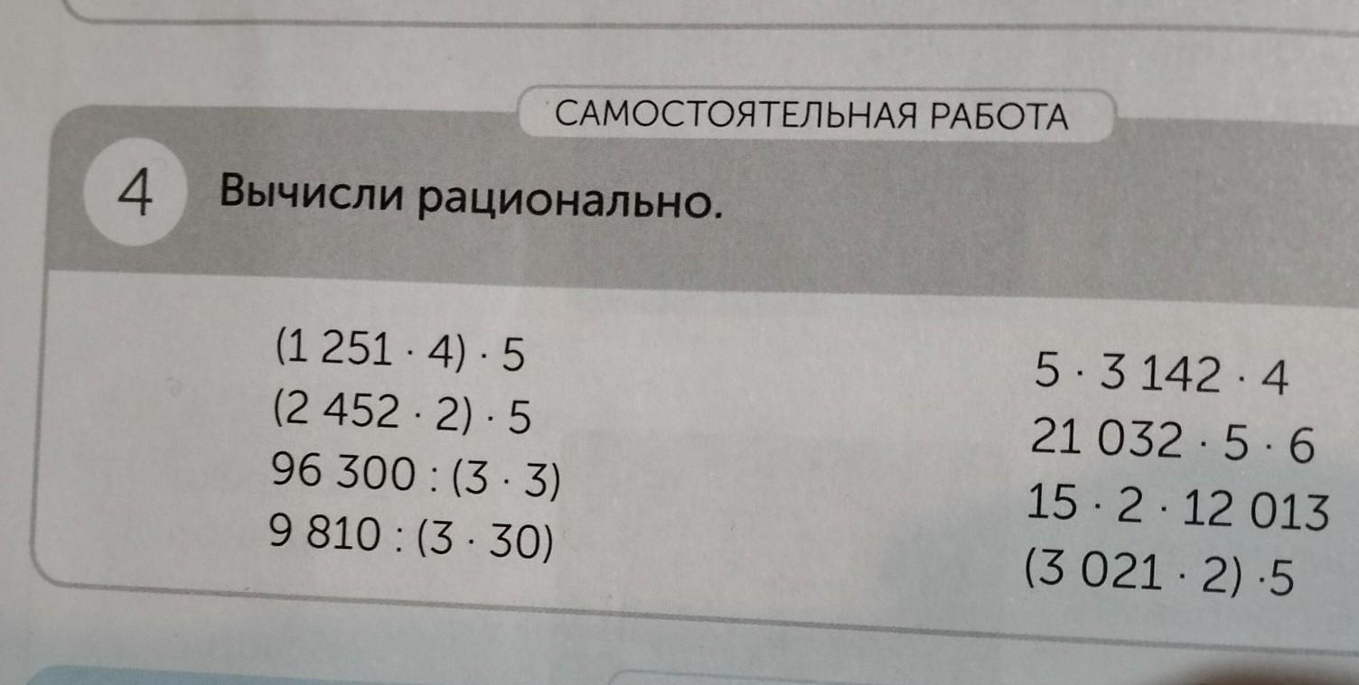 4 САМОСТОЯТЕЛЬНАЯ РАБОТА Вычисли рационально. (1 251-4)-5 (2 452-2)-5 96 300: (3-3) 9 810 (330) 5.3142.4 21 032 5 6 15 2 12 013 (3 021-2)-5 .
