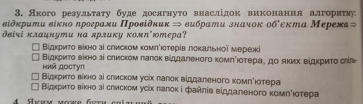 Якого результату буде досягнуто внаслідок виконання алгоритму: відкрити вікно програми Провідник → вибрати значок об'єкта Мережа двічі клацнути на ярлику комп'ютера? Відкрито вікно зі списком комп'ютерів локальної мережі ■ Відкрито вікно зі списком папок віддаленого комп'ютера, до яких відкрито спіль. ний доступ ■ Відкрито вікно зі списком усіх папок віддаленого комп'ютера ■ Відкрито вікно зі списком усіх папок і файлів віддаленого комп'ютера KOMIT