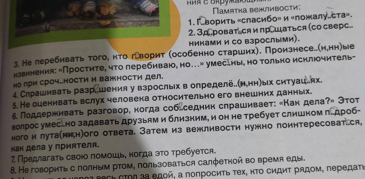 1. Выпишите из памятки вежливости выделенный абзац Вставьте, где это необходимо, пропущенные буквы Выделите суффиксы у отглагольных прилага- тельных и причастий