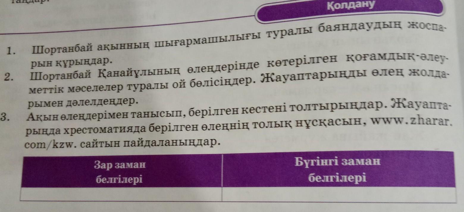 1. Шортанбай ақынның шығармашылығы туралы баяндаудың жоспа- рын құрыңдар. 2. Шортанбай Қанайұлының өлендерінде көтерілген қоғамдық-әлеу- меттік мәселелер туралы ой бөлiсiндер. Жауаптарынды олен жолда- 3. рымен дәлелдеңдер. Акын елендерiмен танысып, берілген кестені толтырыңдар. Жауапта- рында хрестоматияда берілген өлеңнің толық нұсқасын, www.zharar. com/kzw. caйтын пайдаланындар. Зар заман белгiлерi Бүгінгі заман белгілері