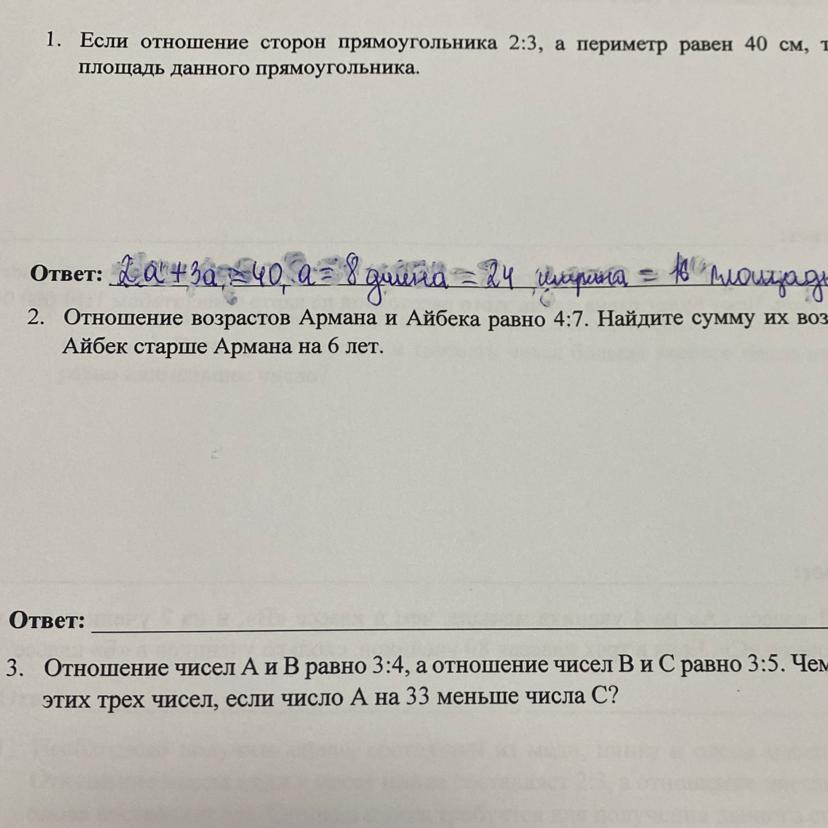 2. Отношение возрастов Армана и Айбека равно 4:7. Найдите сумму их возрастов, если
