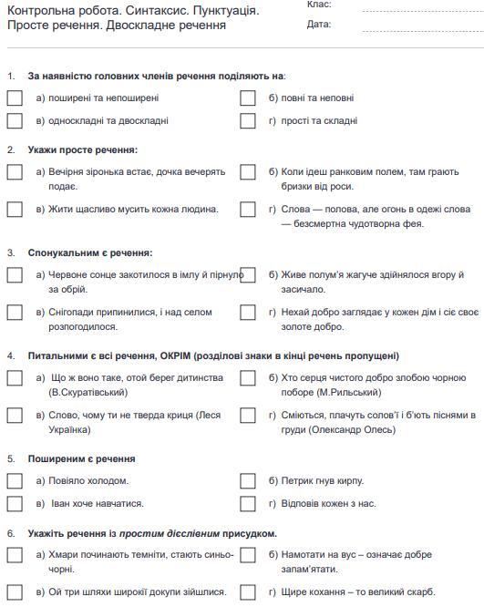 Помогите решить контрольную по теме "Синтаксис. Пунктуація. Просте речення. Двоскладне речення."