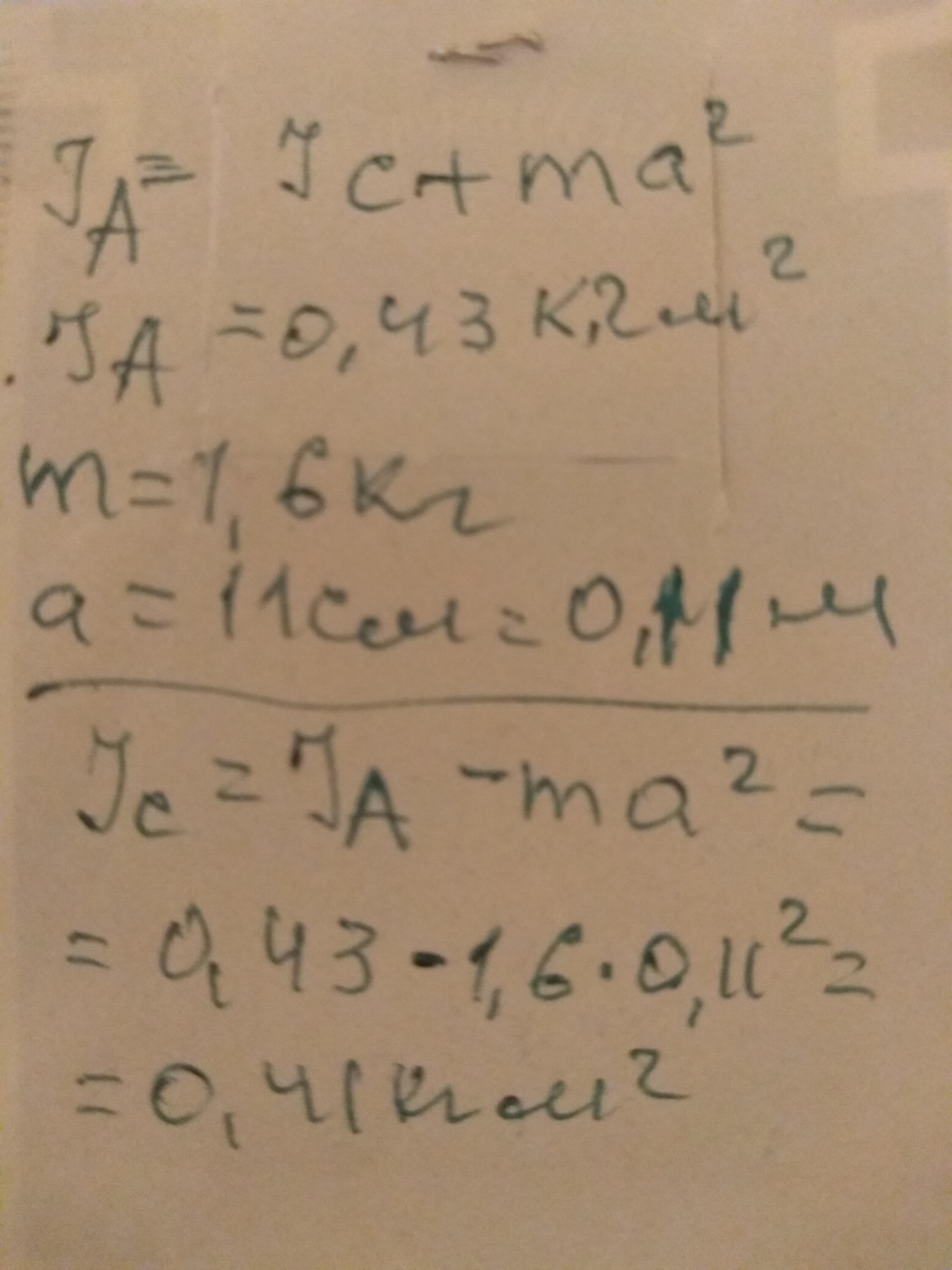 Момент инерции тела массой 1,6 кг по отношению к некоторой оси составляет 0,43 кг·м2. В случае параллельного переноса оси вращения на 11 см, она будет проходить через центр масс. Какому значению будет равна моменту инерции тела после переноса оси вращения?