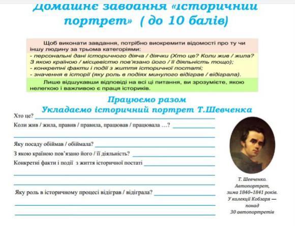 Домашнє завдання «історичнии портрет» (до 10 балів) щоб виконати завдання, потрiбно виокремити відомості про ту чи iншу людину за трьома категоріями: - персональні дані історичного діяча/дiячки (Хто це? Коли жuе /жила? З якою країною / мiсцевістю пов'язано його // дiяльнiсть мощо); - конкретні факти і події з життя історично посматi; - значення в icmoрії (яку роль в подіях минулого відіграв / відіграла). Лише відшукавши відповіді на всі ці питання, ви зрозумієте, якою нелегкою і важливою є праця істориків. Працюємо разом Укладаємо історичний портрет Т.Шевченка Коли жив/жила, правив / правила, працював /працювала ...? Хто це? Яку посаду обіймав/обіймала? З якою країною пов'язано його / її дiяльнiсть? Конкретні факти і події з життя історичної постаті Яку роль в історичному процесі відіграв/відіграла? Т. Шевченко Aemonopmpem, зима 1840-1841 років. У колекцi Кобзаря - понад 30 aemonopmpemie. ПОЖАЛУЙСТА СРОЧНО!