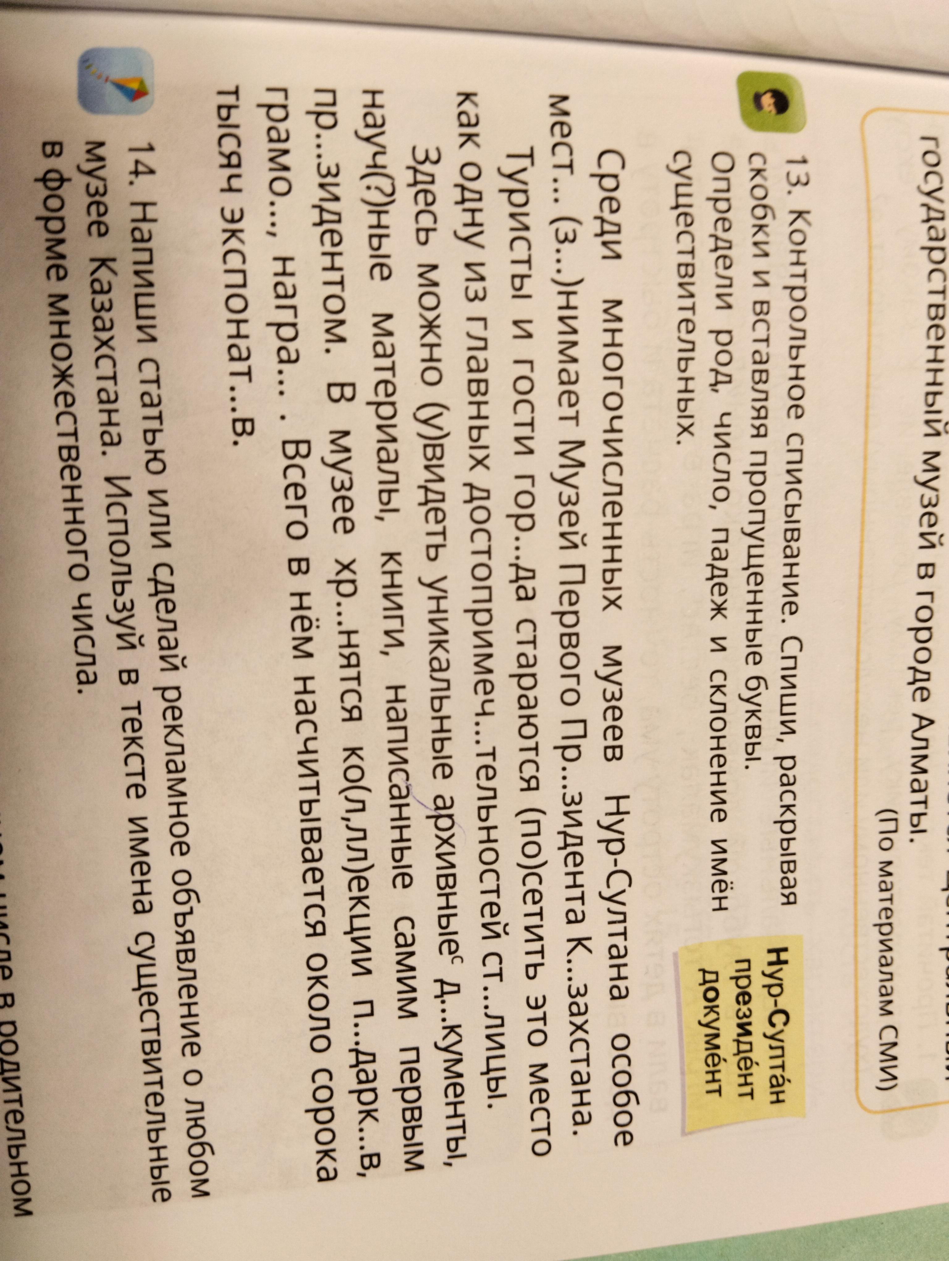 Ответ: Среди многочисленных музеев (м.р., мн.ч., Р.п., ІІ скл.) Нур-Султана (м.р., ед.ч., Р.п., ІІ скл.) особое место (ср.р., ед.ч., В.п., ІІ скл.) занимает Музей (м.р., ед.ч., И.п., ІІ скл.) Первого Президента (м.р., ед.ч., Р.п., ІІ скл.) Казахстана (м.р., ед.ч., Р.п., ІІ скл.) Туристы (м.р., мн.ч., И.п., ІІ скл.) и гости (м.р., мн.ч., И.п., ІІ скл.) города (м.р., ед.ч., Р.п., ІІ скл.) стараются посетить это место (ср.р., ед.ч., В.п., ІІ скл.) как одну из главных достопримечательностей (ж.р., мн.ч., Р.п., ІІІ скл.) столицы (ж.р., ед.ч., Р.п., І скл.) Здесь можно увидеть уникальные архивные документы (м.р., мн.ч., В.п., ІІ скл.), научные материалы (м.р., мн.ч., В.п., ІІ скл.), книги (ж.р., мн.ч., В.п., І скл.), написанные самим первым президентом (м.р., ед.ч., Т.п., ІІ скл.) В музее (м.р., ед.ч., П.п., ІІ скл.) хранятся коллекции (ж.р., мн.ч., И.п., І скл.) подарков (м.р., мн.ч., Р.п., ІІ скл.), грамот (ж.р., мн.ч., Р.п., І скл.), наград (ж.р., мн.ч., Р.п., І скл.) Всего в нём насчитывается около сорока тысяч экспонатов (м.р., мн.ч., Р.п., ІІ скл.)