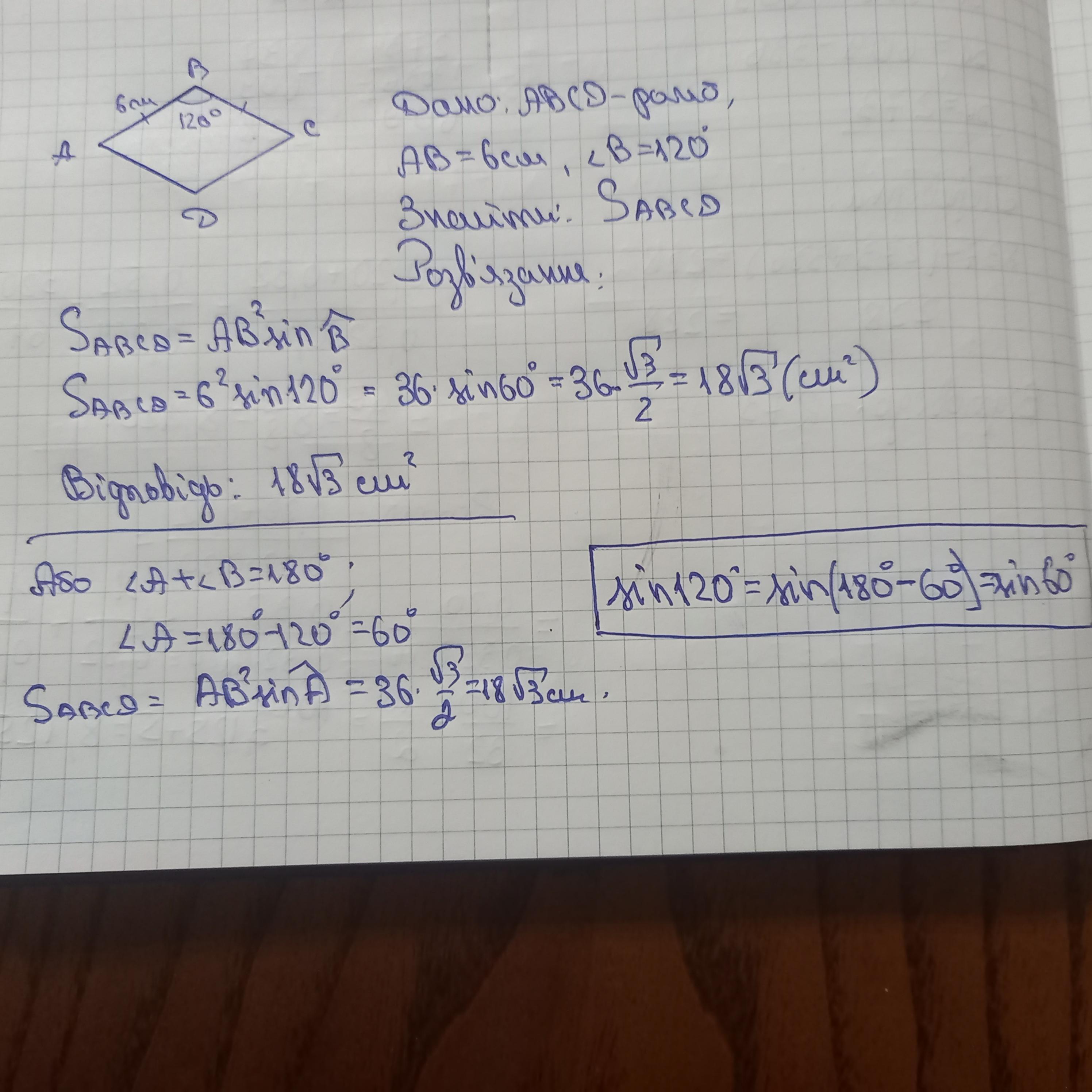 Знайдіть площу ромба,сторона якого дорівнює 6 см , а кут 120°