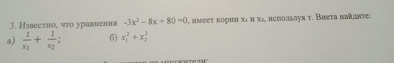 3. Известно, что уравнения -3х² - 8x + 80 =0, имеет корни х1 и х2, используя т. Виета найдите: a) 1/ х1² 1/х2² 6) x1² + х2²