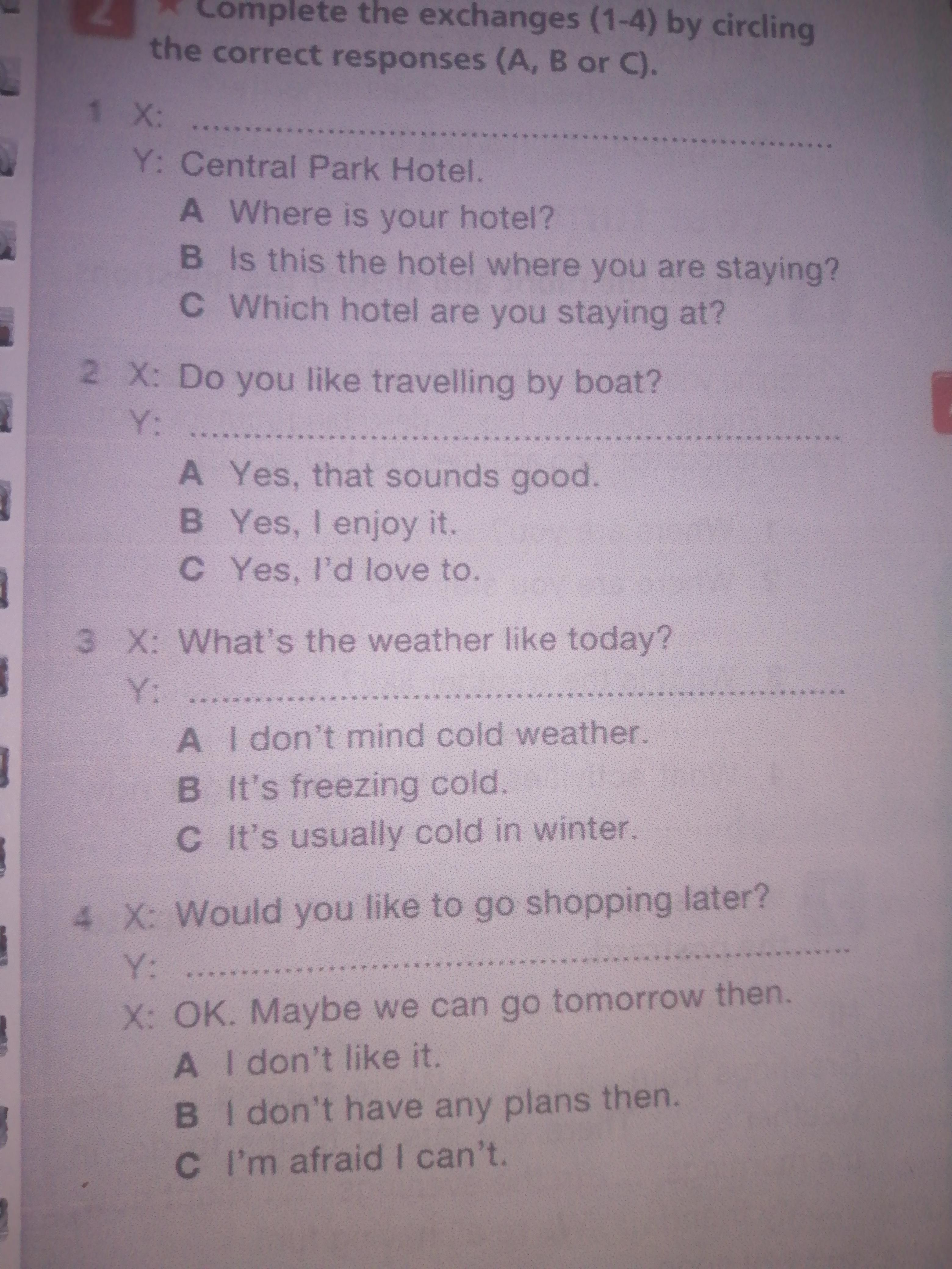 Complete the exchanges (1-4) by ciriling the correct responses (A, B or C)
