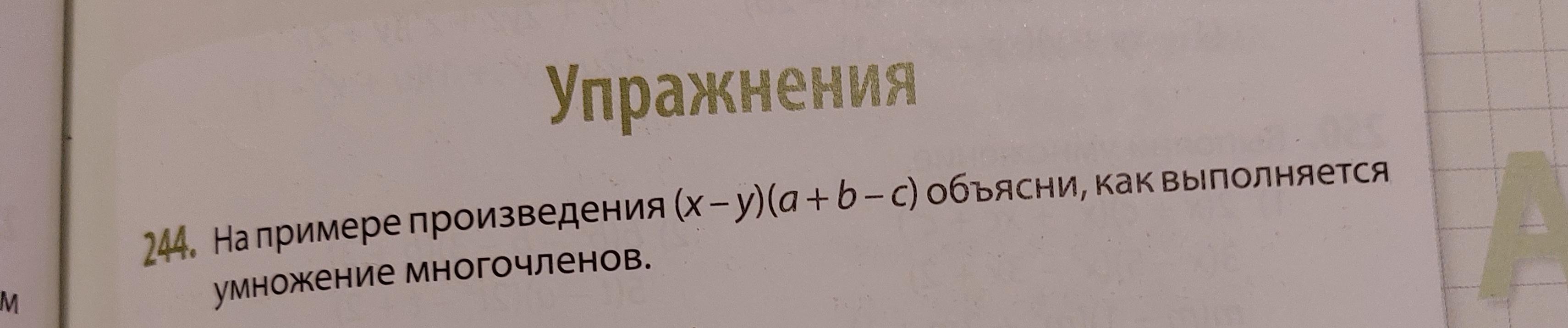 20 БАЛОВ Помогите пожалцйса ,244. На примере произведения (x - y)(a + b - c) обьясни, как выполняется Умножение многочленов.