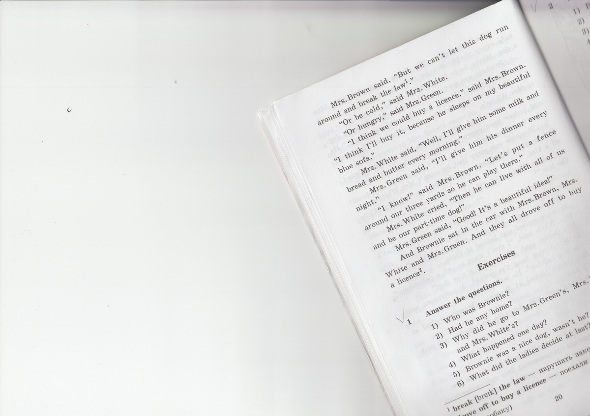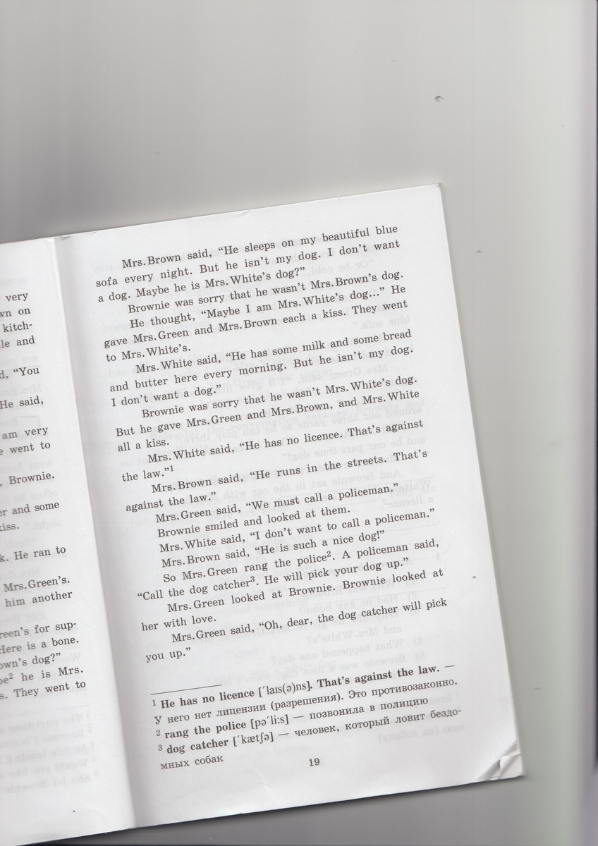 Миссис Браун сказала: -"Он спит на моём прекрасно голубом диване каждую ночь. Но он не мой пёс. Я не хочу собаку. Может это собака Миссис Уайт?"