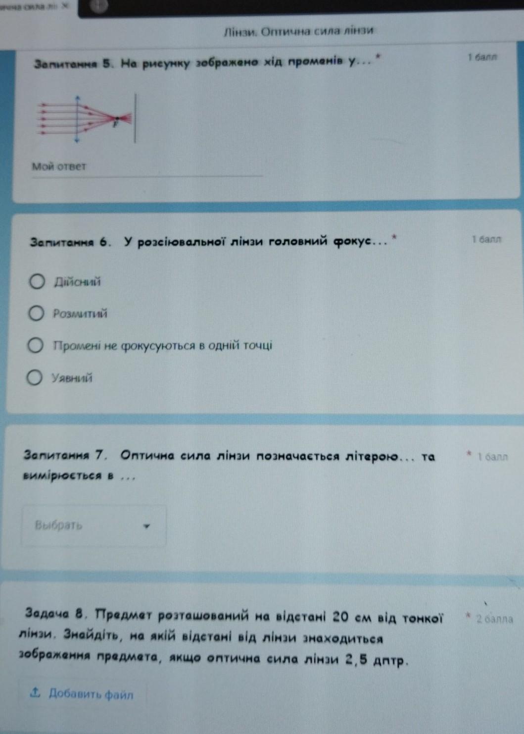 Запитання 4. Увігнута лінза це... 0 Лінза, товщина якої посерединi бiльша, ніж біля країв 0 Лінза, товщина якої посередині менша, ніж біля крав О Лiнза з браком 0 Увігнута з обох боків