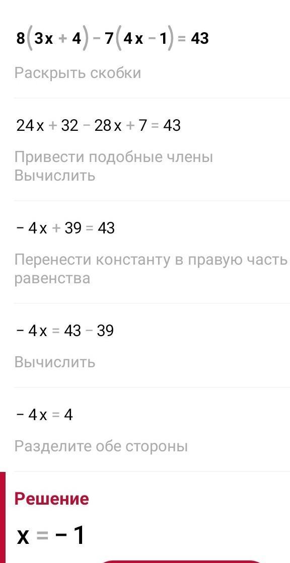 одночлена на многочлен 144. Розв'яжи рiвняння: a) 3(7x - 2) + 2(5 - 2x) = 38; б) 8(3x + 4) - 7(4x - 1) = 43; в) 2x(3 - 4x) + 4(2x² - x + 1) = 4; - Inka