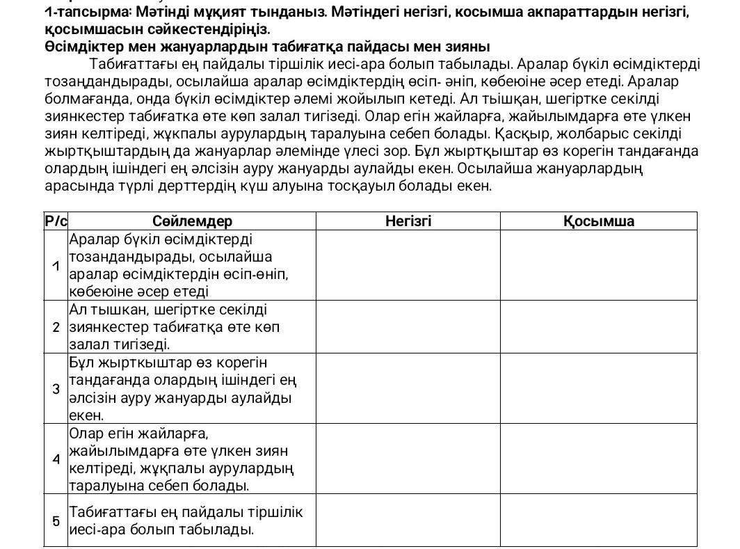 1-тапсырма: Мәтінді мұқият тынданыз. Мәтіндегі негізгі, косымша акпараттардын негізгі, қосымшасын сәйкестендіріңіз. Өсімдіктер мен жануарлардын табиғатқа пайдасы мен зияны Табиғаттағы ең пайдалы тіршілік иесі-ара болып табылады. Аралар бүкіл өсімдіктерді тозаңдандырады, осылайша аралар өсімдіктердің өсіп- әніп, көбеюіне әсер етеді. Аралар болмағанда, онда бүкіл өсімдіктер әлемі жойылып кетеді. Ал тышқан, шегіртке секілді зиянкестер табиғатка өте көп залал тигізеді. Олар егін жайларға, жайылымдарға өте үлкен зиян келтіреді, жұкпалы аурулардың таралуына себеп болады. Қасқыр, жолбарыс секілді жыртқыштардың да жануарлар әлемінде үлесі зор. Бұл жыртқыштар өз корегін тандағанда олардың ішіндегі ең әлсізін ауру жануарды аулайды екен. Осылайша жануарлардың арасында түрлі дерттердің күш алуына тосқауыл болады екен.