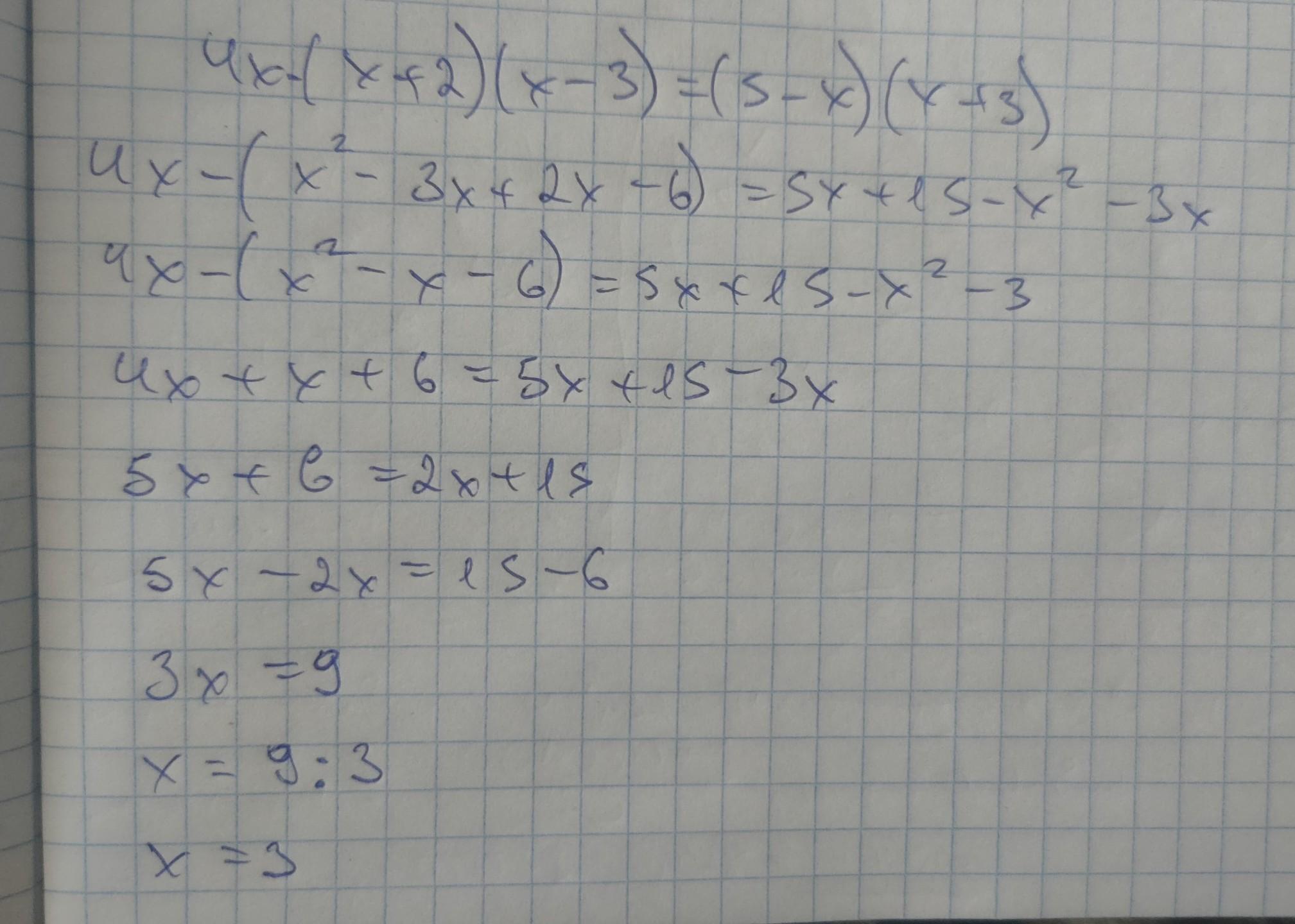 решите уравнение 4x-(x+2)(x-3)=(5-x)(x+3)