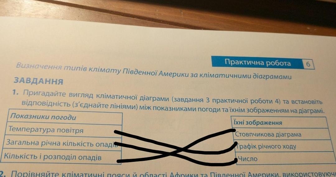1. Пригадайте вигляд кліматичної діаграми (завдання з практичної роботи 4) та встановіть відповідність (з'єднайте лініями) між показниками погоди та їхнім зображенням на діаграмі
