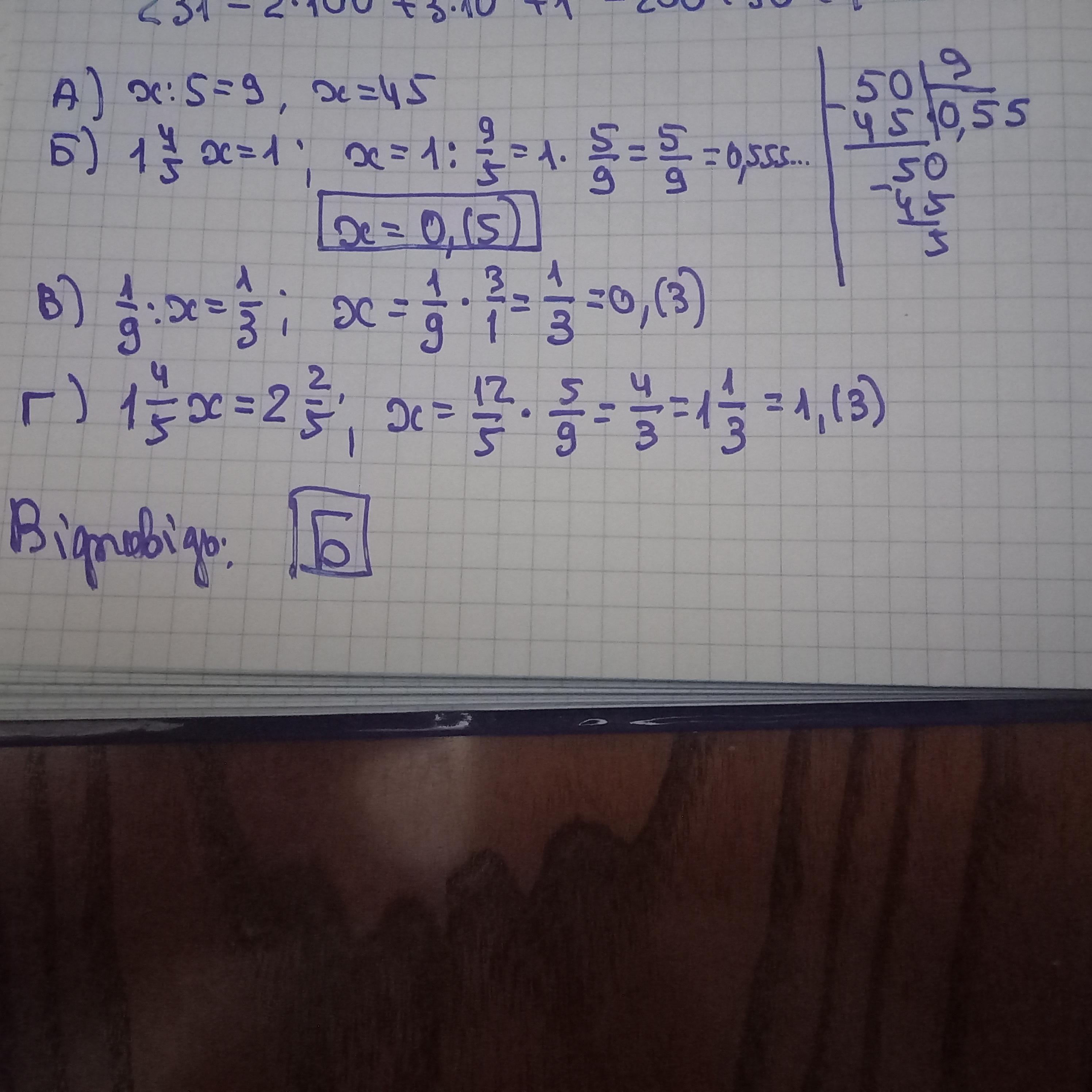 А) х:5=9; Б) 1 ціла 4/5*х=1 В) 1/9:х=1/3 Г) 1 ціла 4/5*х=2 цілих 2/5