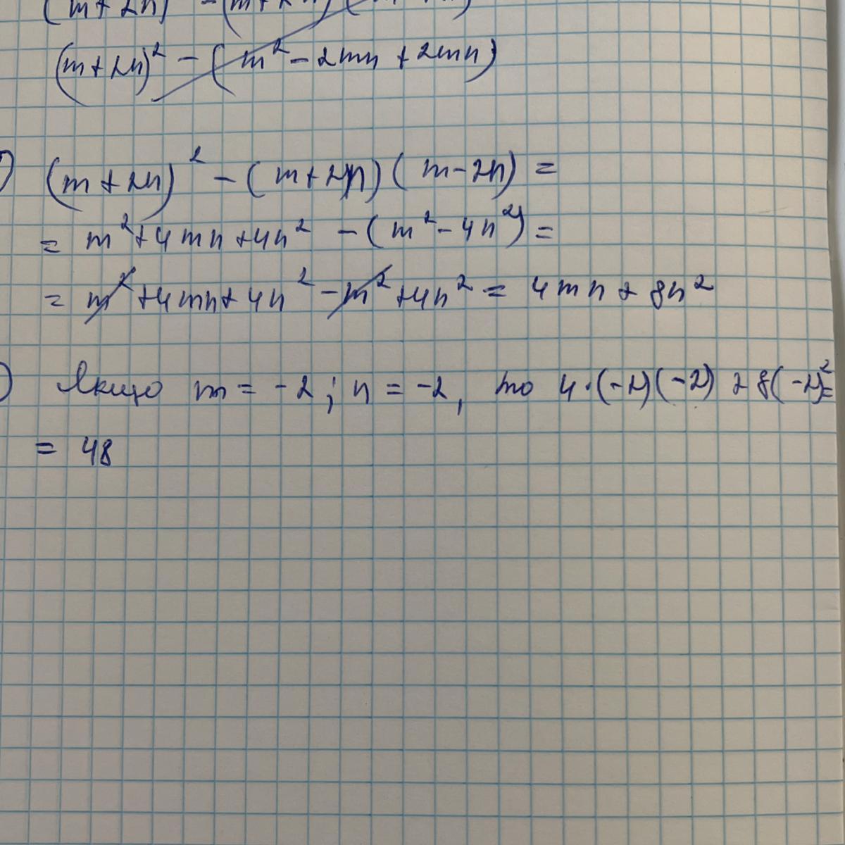 Спростити вираз (m+2n)²-(m+2n)(m-2n) і встановити значення виразу при m=-2, n=-2