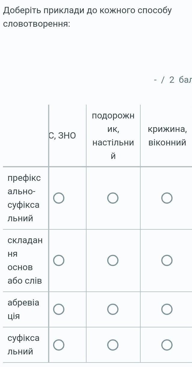Доберіть приклади до кожного способу словотворення: префікс ально- суфікса льний складан НЯ OCHOB або слів абревіа ція суфікса льний спортбаз а, біло- синій о о о о ЄС, ЗНО - / 2 балів подоро: ИК, настіль й о