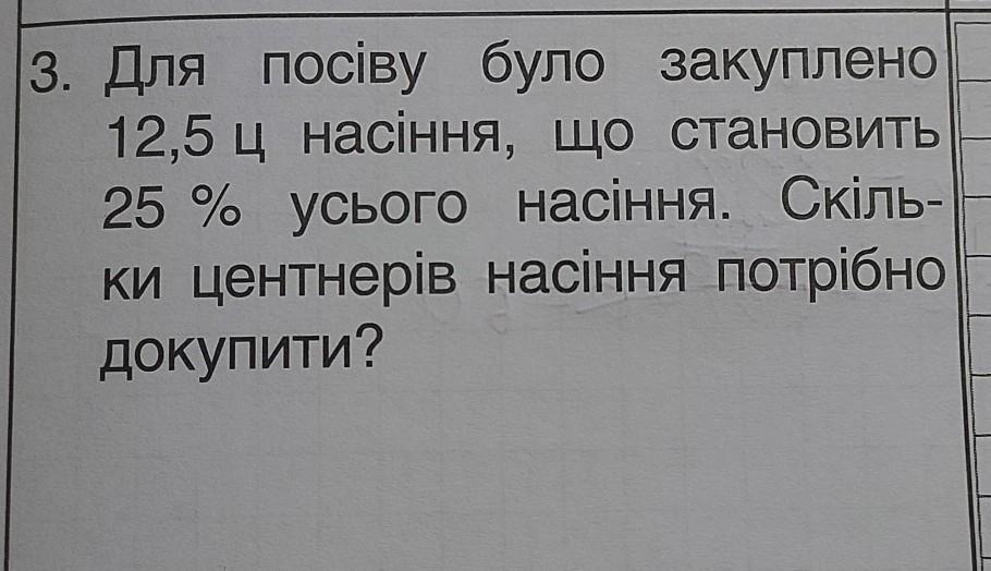 3. Для посіву було закуплено 12,5 ц насіння, що становить 25 % усього насіння. Скіль- ки центнерів насіння потрібно докупити? СРОЧНО ДАМ 15 БАЛОВ