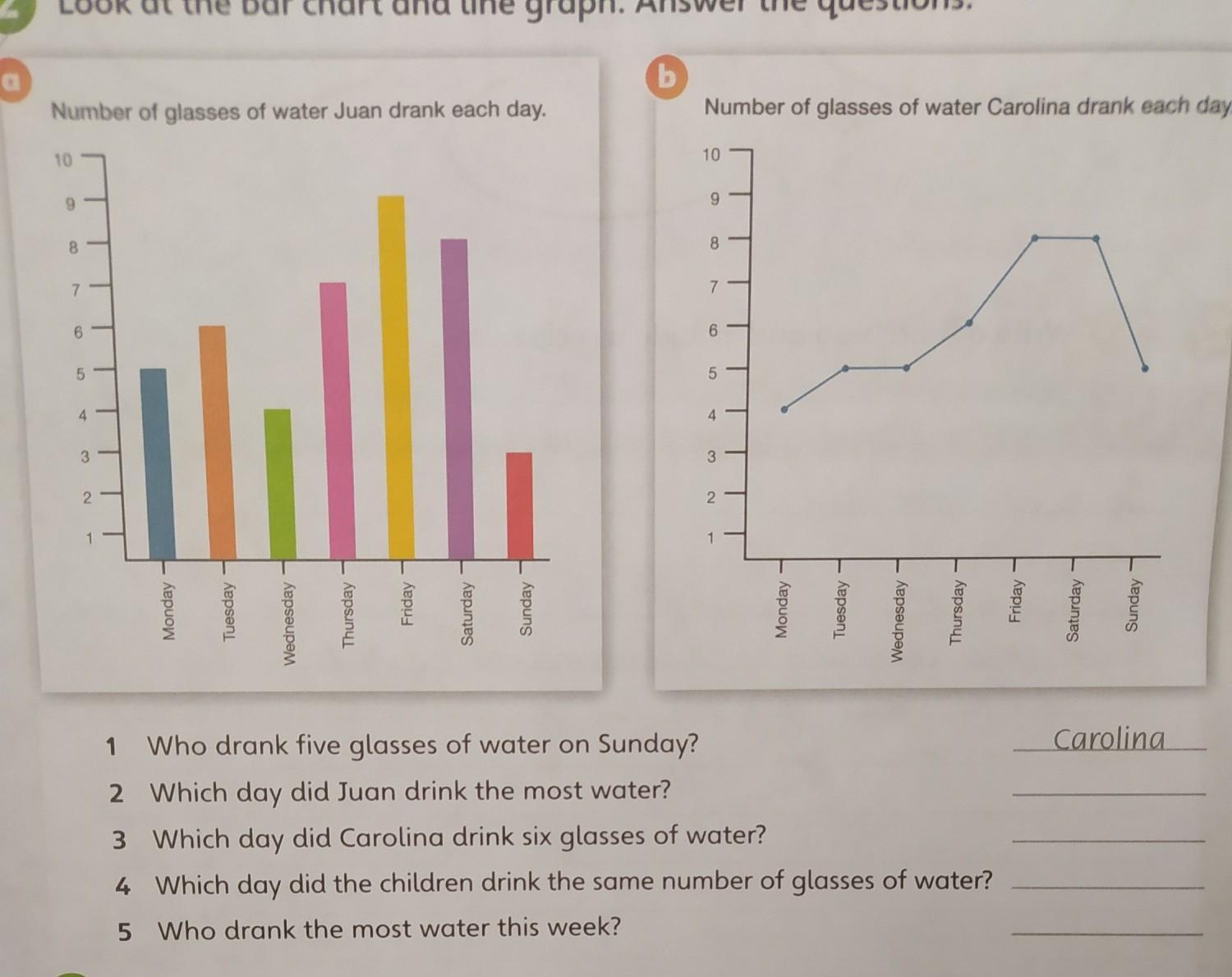 1 Who drank five glasses of water on Sunday? Carolina. 2 Wich day did Juan drink the most water? 3 Which day did Carolina drink six glasses of water? 4Which day did the children drink the same number of glasses of water? 5 Who drank the most water this week? помогите срочно! пж пж пж пж пж пж
