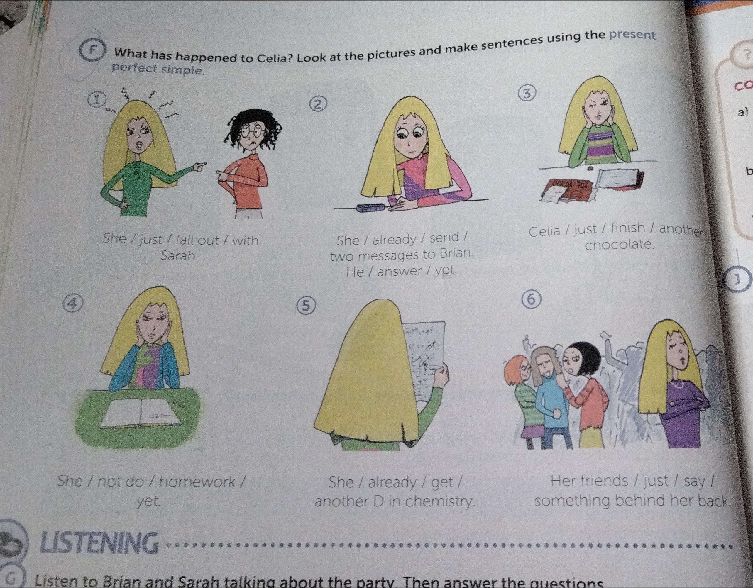 She just fallen out with Sarah. She already has sent two messages to Brian. He has answered yet. Cella just has finished another chocolate. She hasn't done homework yet. She already has gotten another D in chemistry. Her friends just have said something behind her back.