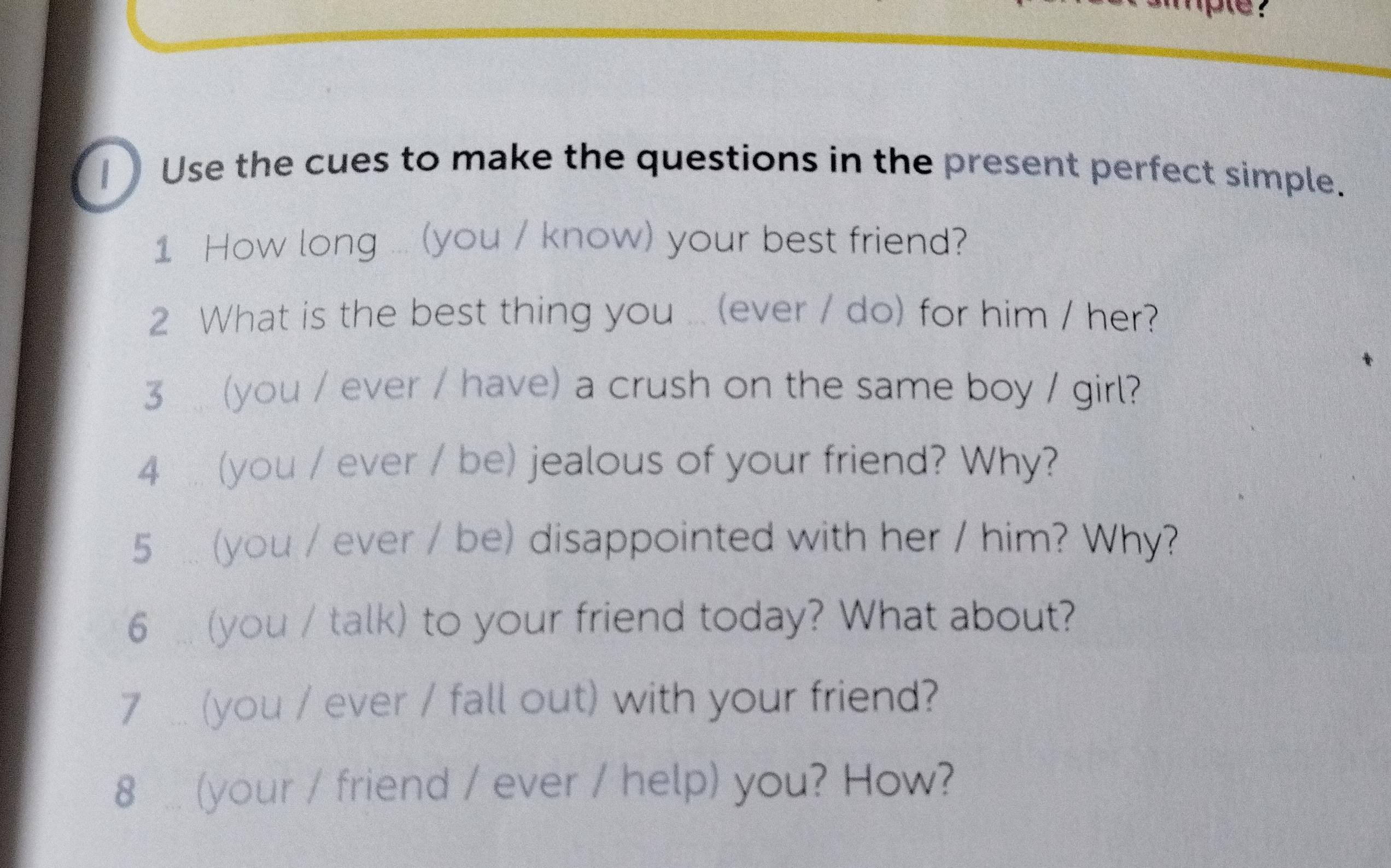 How long you have known your best friend? What is the best thing you ever have done for him/her. Have have ever you a crush on the same boy/girl. Have been you ever jealous of your friend? Why? Have been you ever disappointed with her/him? Why? Have you talken to your friend today? What about? Have fallen out you ever with your friend? Have helped your friend you? How?