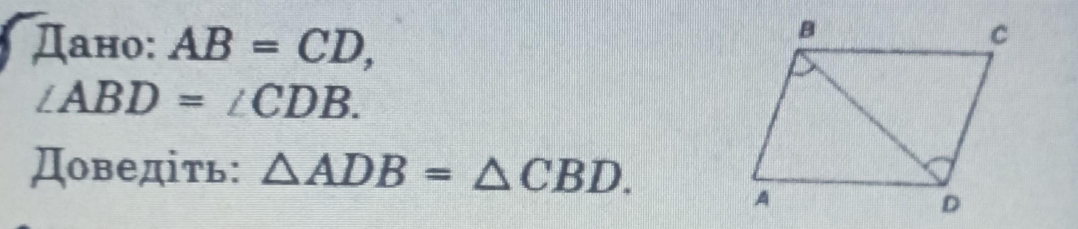Оскільки AB=CD, кут ABD дорівнює куту CDB і BD спільна, то трикутник ADB= CBD за 2 ознакою рівності трикутників.